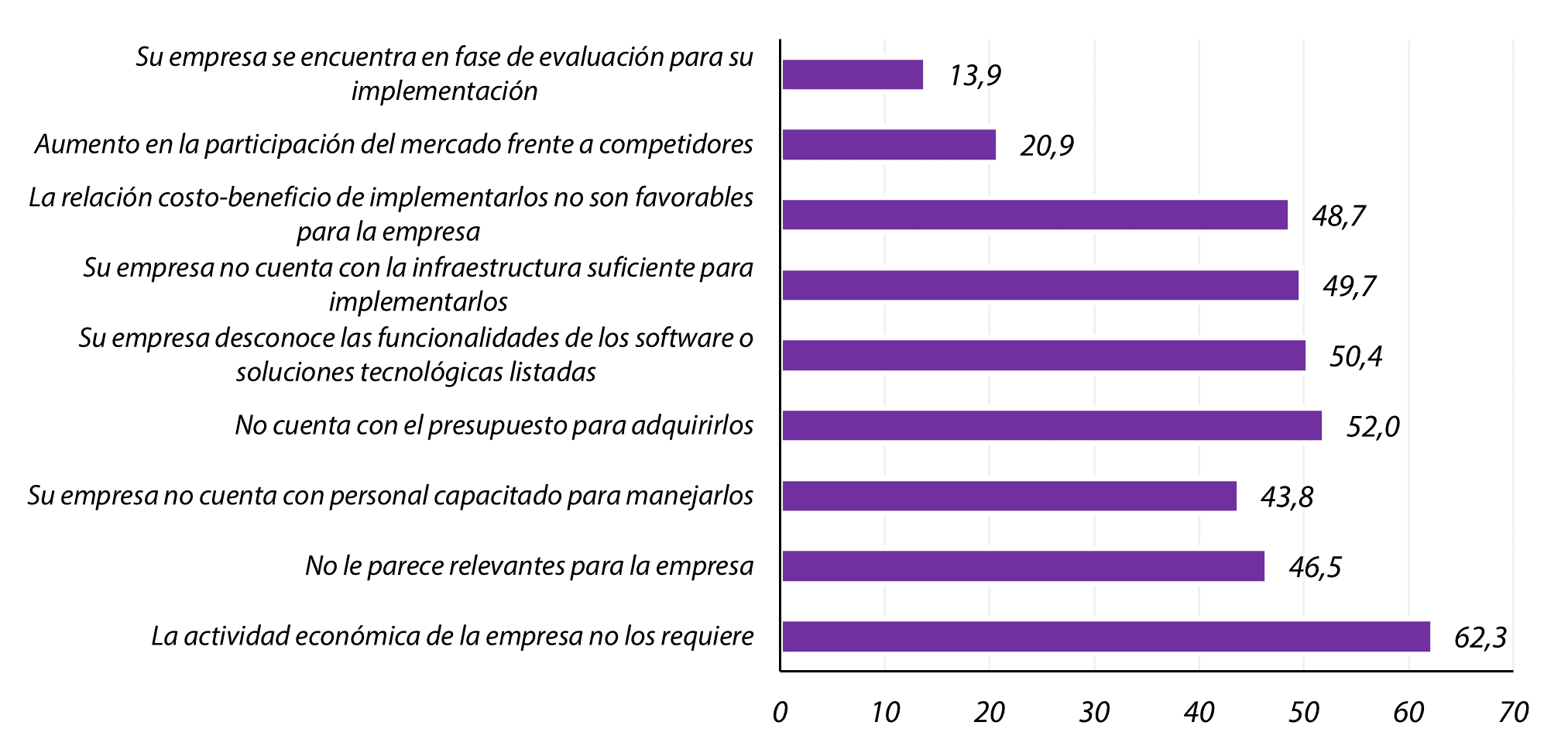Para finalizar, las empresas que no cuentan con herramientas tecnológicas como las descritas previamente, manifestaron que las principales razones para no tenerlas es que su actividad económica no las requería (62,3 %), que no contaban con el presupuesto para adquirirlas (52 %), que desconocían de las funcionalidades de los software o soluciones tecnológicas listadas dentro de la encuesta (50,4 %) o que no contaban con la infraestructura para implementarlas (49,7 %).